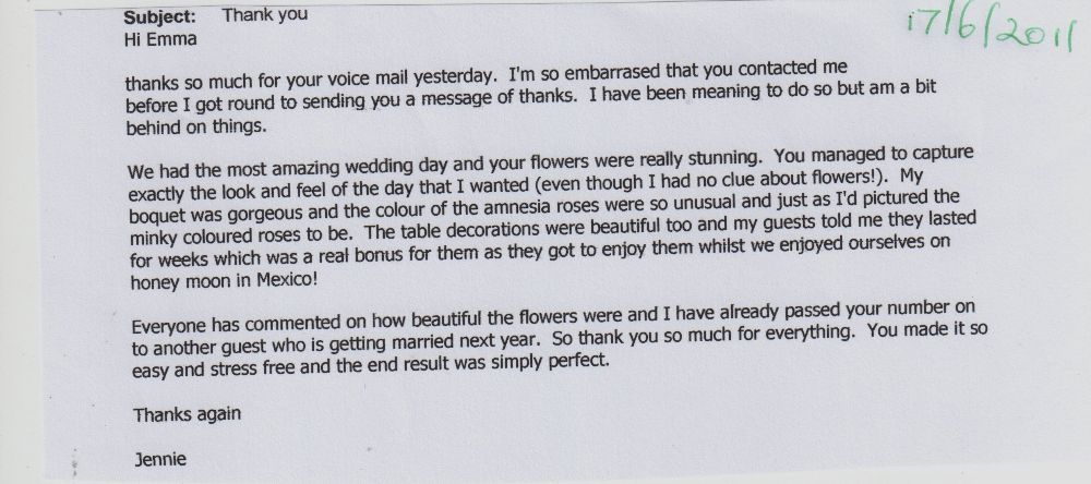 Kevin and I would like to thank you so much for the beautiful flowers that you did for Hayley and Alan's wedding yesterday it took our breath away when we saw them and far exceeded our expectations. Your expertise and hard work was so very much appreciated. So many people commented on the wonderful flowers yesterday and I can honestly say was one of the most memorable aspects of the day. Hayley's bouquet was beautiful as was the bridesmaids. It made the venue homely and beautiful and enticing to come in. Flowers are a very important part of a wedding and you captured it so well. We collected the flowers this morning and I have had a lovely time giving them out to people to have to enjoy. I am taking one of the table displays to my mother's Nursing Home to put in her bedroom as she always had flowers in her house when she lived at home with my father and I hope the smell and colours she will enjoy. I tried to find you yesterday Emma to personally thank you but I could not find you and I apologise for not thanking you face to face.